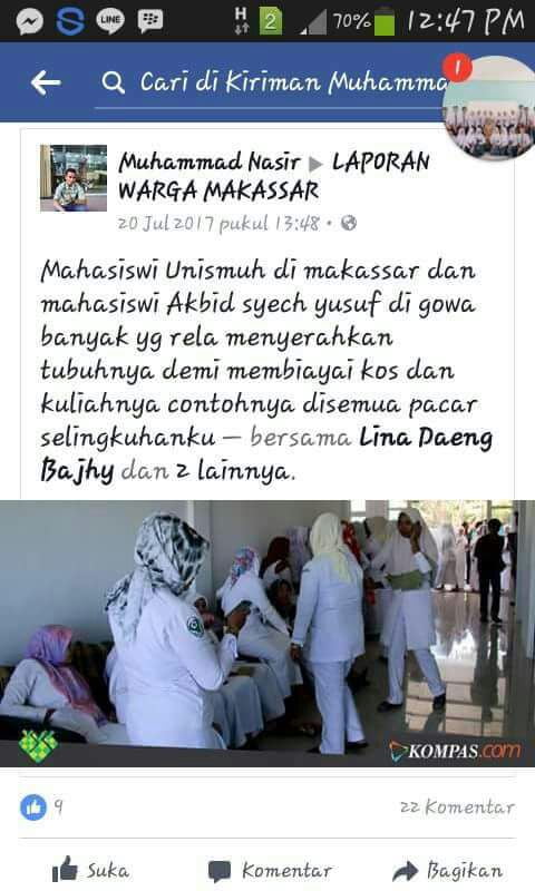 Inilah salah satu postingan akun Muhammad Nasir yang membuat warga Takalar marah dan mencarinya untuk membuat perhitungan dengannya. “Hanya dengan modal pulsa dan uang yang sedikit cewek takalar yang tinggal dirumah kontrakan dimakassar berhasil kunikahi tampa uang panai saya bebas menikmati tubuhnya sampe puas dan saat ini dia sudah hamil ternyata cewek takalar begitu murah dan gampang didapatkan”