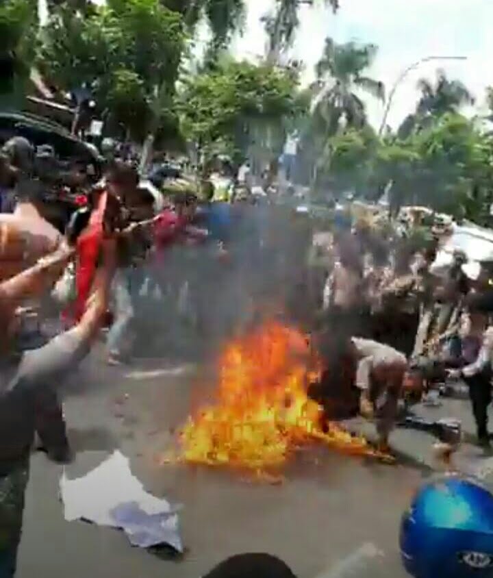 Entah siapa yang memulai, tiba tiba ban bekas terbakar di tengah kerumunan puluhan mahasiswa dan aparat kepolisian, bentrokpun tak bisa di hindari, saling pukul dan saling tendang menjadi tontonan ratusan warga pengguna jalan jendral Sudirman. Namun bentrok tak berlangsung lama, karena pimpinan masing masing pihak  cepat melerai.