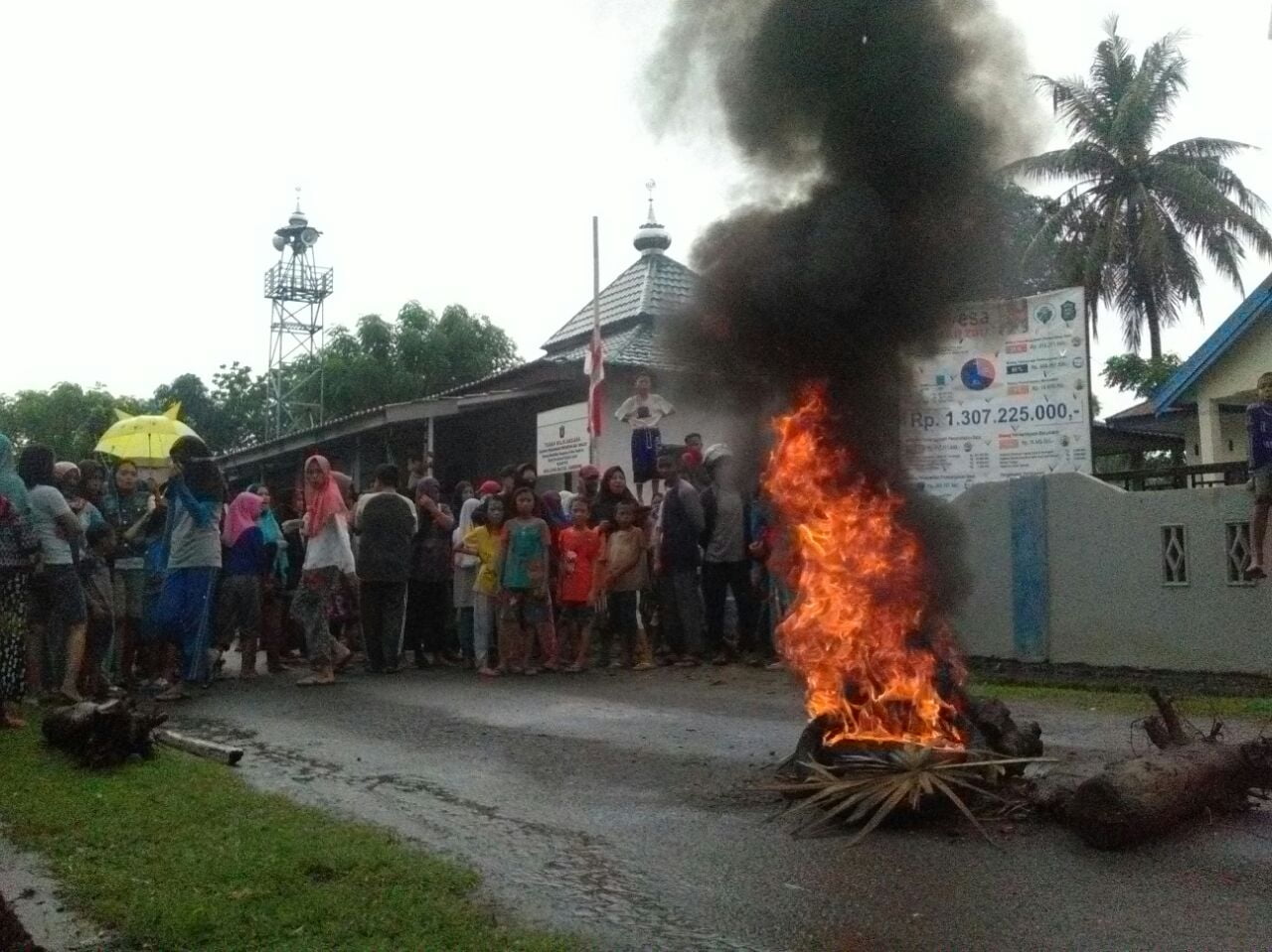 Puluhan ibu ibu tersebut, memblokir jalan di depan kantor desa, dan melakukan pembakaran ban bekas. Aksi yang dilakukan oleh para ibu ibu ini, di duga dilakukan secara spontanitas.