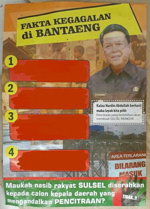 Ketua Forkom Relawan Prof Andalan mengatakan, sempat ada selebaran yang disebar di sejumlah titik. Di kertas tersebut ada muatan negatif campaign (kampanye negatif) yang menyatakan Prof Nurdin Abdullah gagal memimpin Bantaeng, padahal beliau sudah dikenal dengan Bupati yang memiliki prestasi luar biasa dan masuk kategori Kepala Daerah terbaik di Indonesia.
