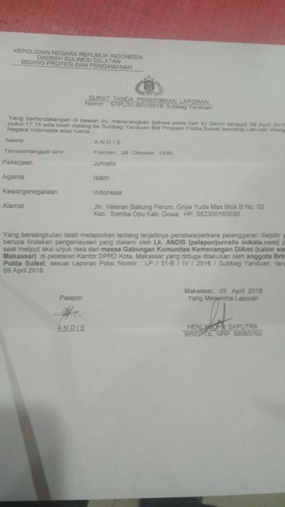 Dalam surat laporannya tersebut, Andis melaporkan jika dirinya dianiaya oleh beberapa oknum aparat Brimob, saat hendak meliput aksi unjuk rasa dari massa gabungan komunitas kemenangan DIAMi (Calon Wali Kota Makassar) di pelataran kantor DPRD Kota Makassar.