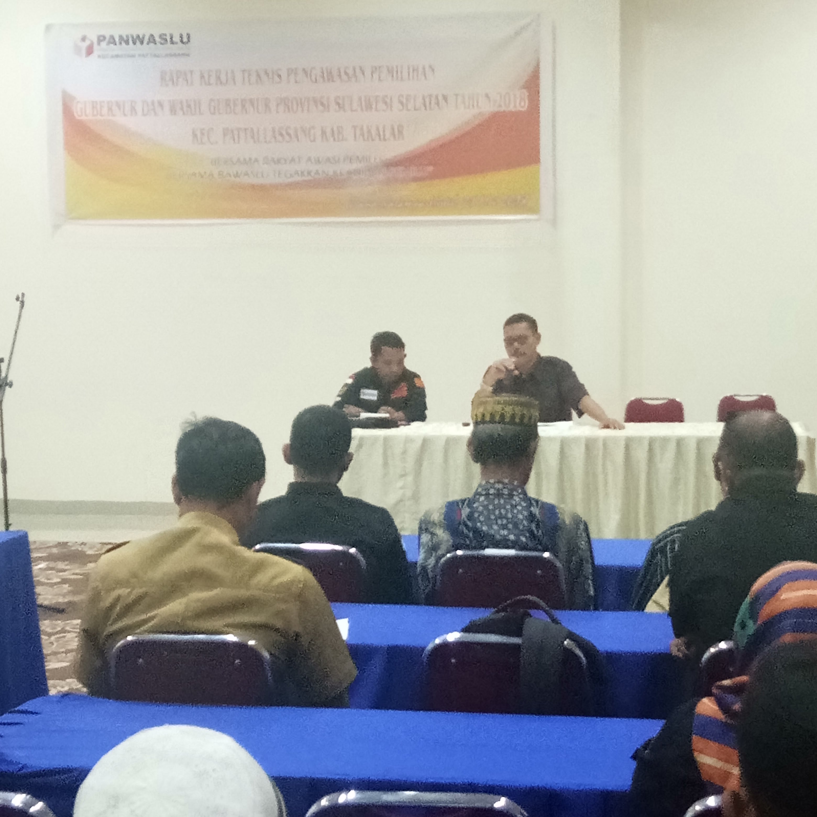 SULSELBERITA.COM, Takalar –  Rapat kerja Tekhnis Pengawasan pemilihan Gubernur Provinsi Sulsel Tahun 2018, yang dilaksanakan oleh Panwascam Kecamatan Pattallasang, bertempat di Hotel Kalampa Kab.Takalar. (Senin,21/5/2018).