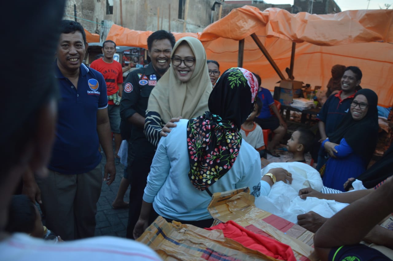 SULSELBERITA.COM. Makassar – Politisi Partai NasDem, Andi Rachmatika Dewi kunjungi korban bencana kebakaran di Malimongan, Kecamatan Wajo, Minggu, (8 Juli 2018).