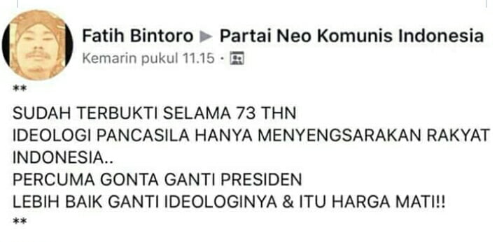 Seperti yang pernah diberitakan oleh media ini sebelumnya, yang menyebutkan akun Fatih Bintoro, menyerukan di media sosial agar ideology pancasila harus di ganti dan itu harga mati, “SUDAH TERBUKTI SELAMA 73 TAHUN, IDEOLOGI PANCASILA HANYA MENYENGSARAKAN RAKYAT INDONESIA, PERCUMA GONTA GANTI PRESIDEN, LEBIH BAIK GANTI IDEOLOGINYA DAN ITU HARGA MATI”  Tulis Fatih Bintoro di Group Facebook  “Partai Neo Komunis Indonesia”.