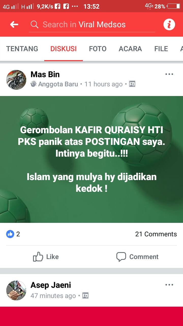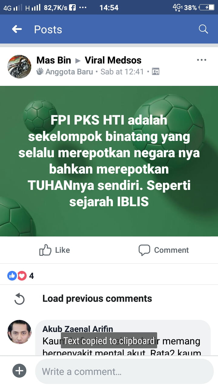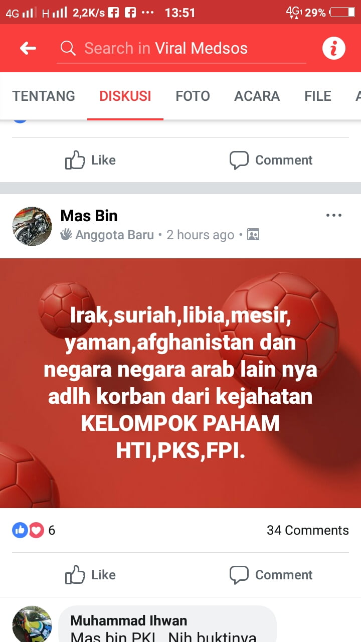 “Irak,suriah,libia,mesir, yaman,afghanistan dan negara negara arab lain nya adalah korban dari kejahatan KELOMPOK PAHAM HTI, PKS, FPI.” salah satu postingan fatih Bintoro alias Mas Bin di group Viral Medsos, yang Rasis dan Fitnah.