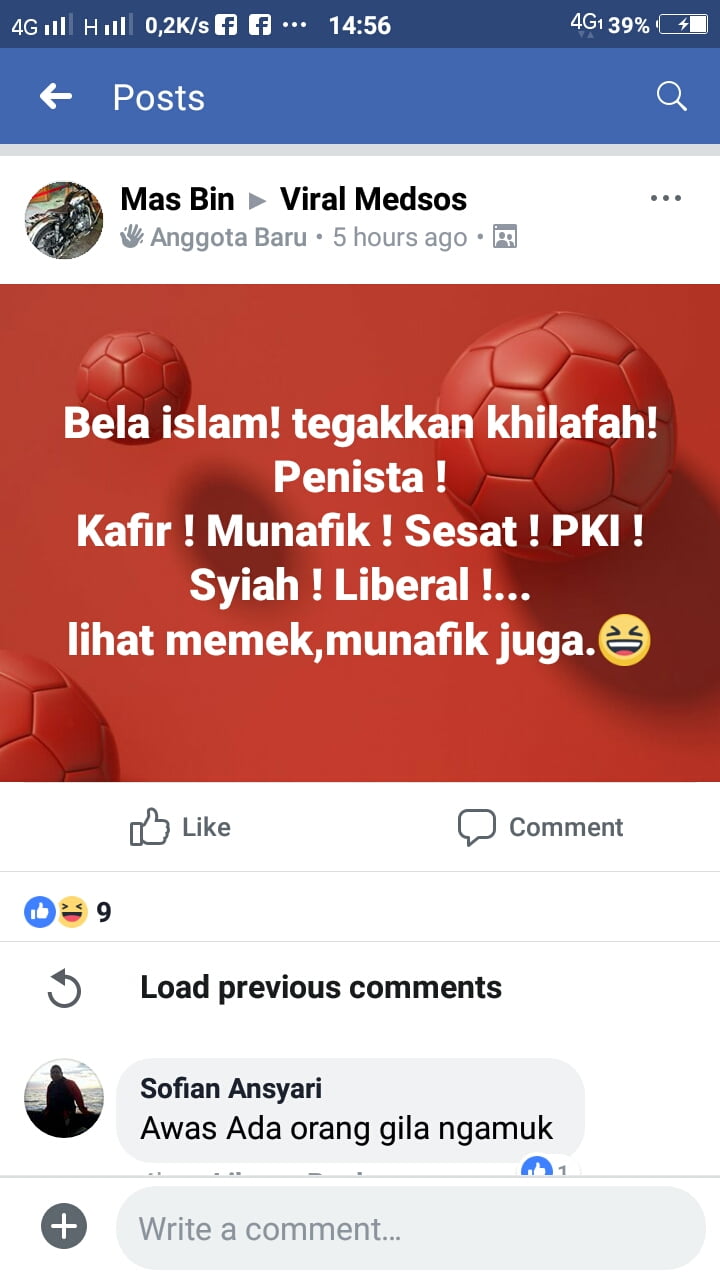 Kafir ! Munafik ! Sesat ! PKI ! Syiah ! Liberal lihat m*m*k, munafik juga”. Salah satu postingannya yang lain.