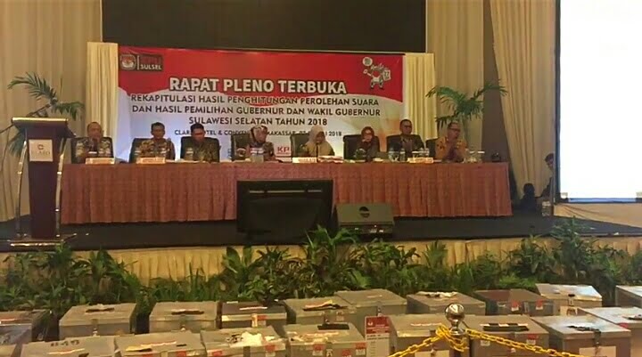 KPU Sulsel yang menggelar rapat pleno secara terbuka, bertempat di Grand Clarion Hotel Makassar, pada Minggu (8/7/2018) malam, telah menyelesaikan hasil rekapitulasi suara secara keseluruhan  Pemilihan Gubernur dan Wakil Gubernur Sulsel.