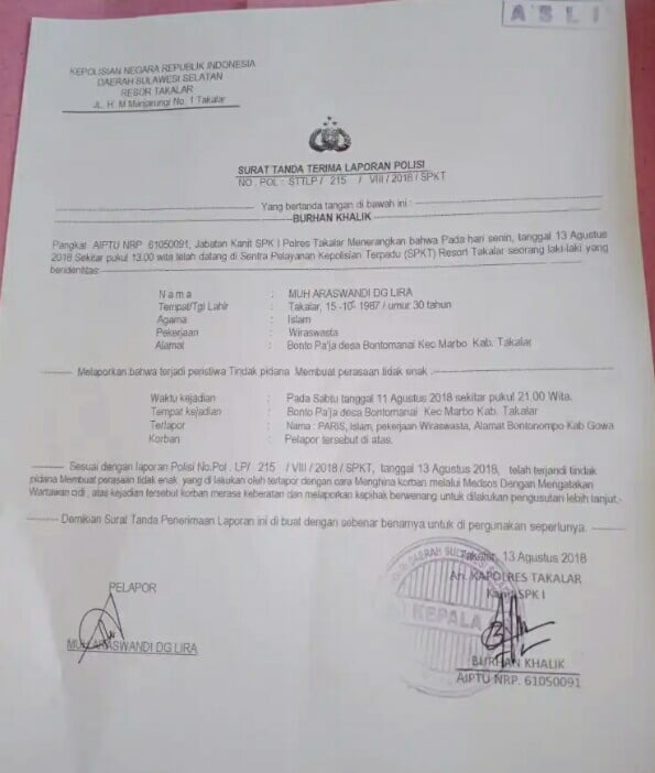 “Kami sudah melaporkan Paris secara resmi ke Polres Takalar, dengan nomor LP 215 IVIII/2018/SPKT, tanggsl 13 Agustus 2018”. Ini bertujuan supaya tidak ada lagi oknum yang menghina profesi wartawan, Jelas Araswandi.