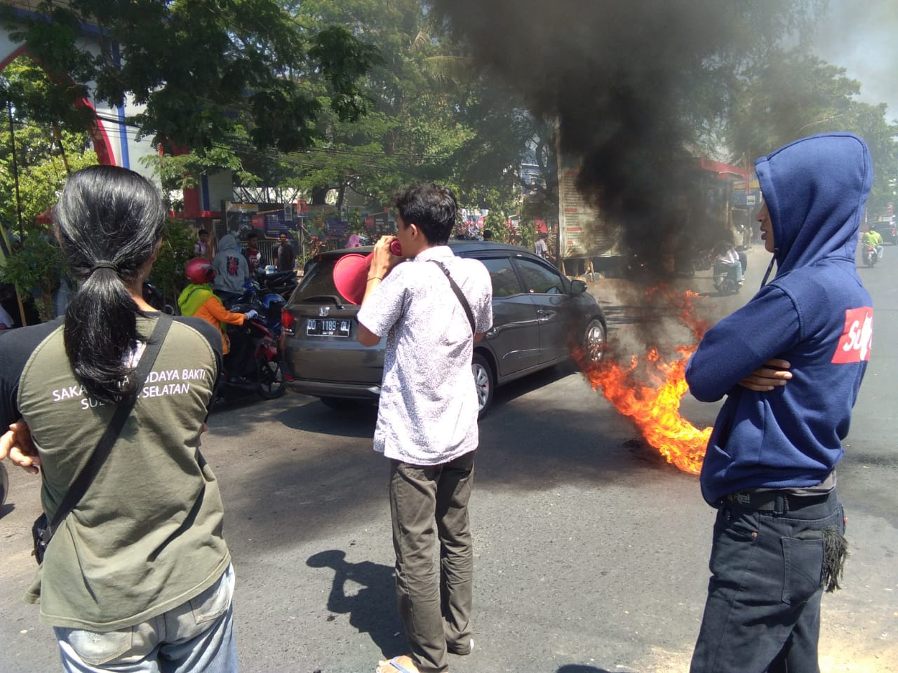 Pengunjuk rasa juga melakukan aksi bakar ban dan menahan satu mobil kontener sebagai panggung orasi. Akibat aksi ini, jalanan di sekitar lokasi aksi mengalami kemacetan.