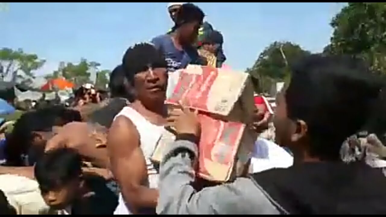 Namun rupanya puluhan warga yang melakukan penjarahan bantuan kemanusiaan tersebut, sama sekali tak menggubrisnya, dan terus saja mengambil barang barang yang di muat dalam mobil truk, laku mengovernya pada puluhan warga lainnya yang ada di bawah.