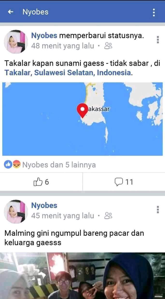 Bagaimana tidak, akun Nyobes (Dg Kenna) memposting ini, “TAKALAR KAPAN TSUNAMI GAEES-TIDAK SABAR”, postingan yang dibuat pada hari ini, (sabtu, 6/10/2018), sekitar pukul 18.41 Wita. Langsung saja diserbu oleh nitizen, namun tidak lama kemudian, postingan tersebut sudah di hapus, namun sudah terlanjur di screenshot oleh nitizen.
