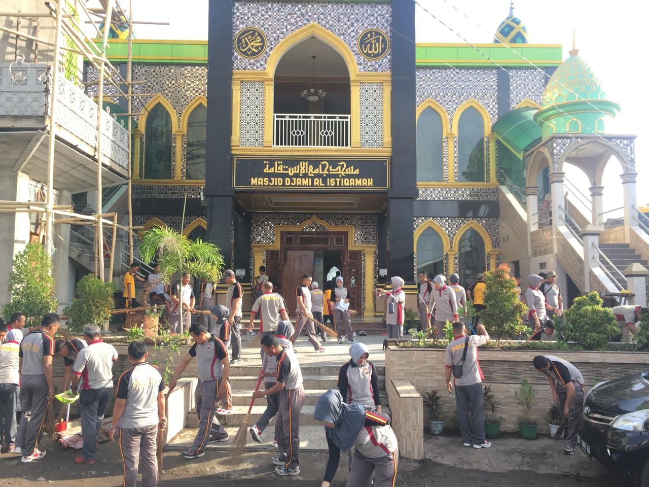 Mulai dari sisi luar hingga sisi bagian dalam mesjid pun tak luput dari jangkauan para personil untuk dibersihkan.