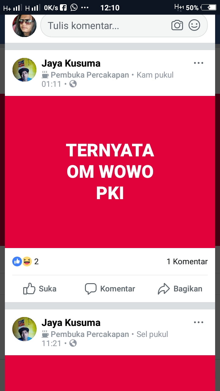 SULSELBERITA.COM. Takalar – Ratusan warga net geram akibat sebuah postingan yang di unggah oleh salah seorang Nitizen yang menggunakan nama “JAYA KUSUMA”,yang di duga pendukung capres Jokowi, postingan yang di unggah di group facebook KABAR TAKALAR tersebut, menyebutkan kalau Prabowo ternyata PKI, “Ternyata Prabowo PKI” tulis Jaya Kusuma, (Jumat, 9/11/2018).
