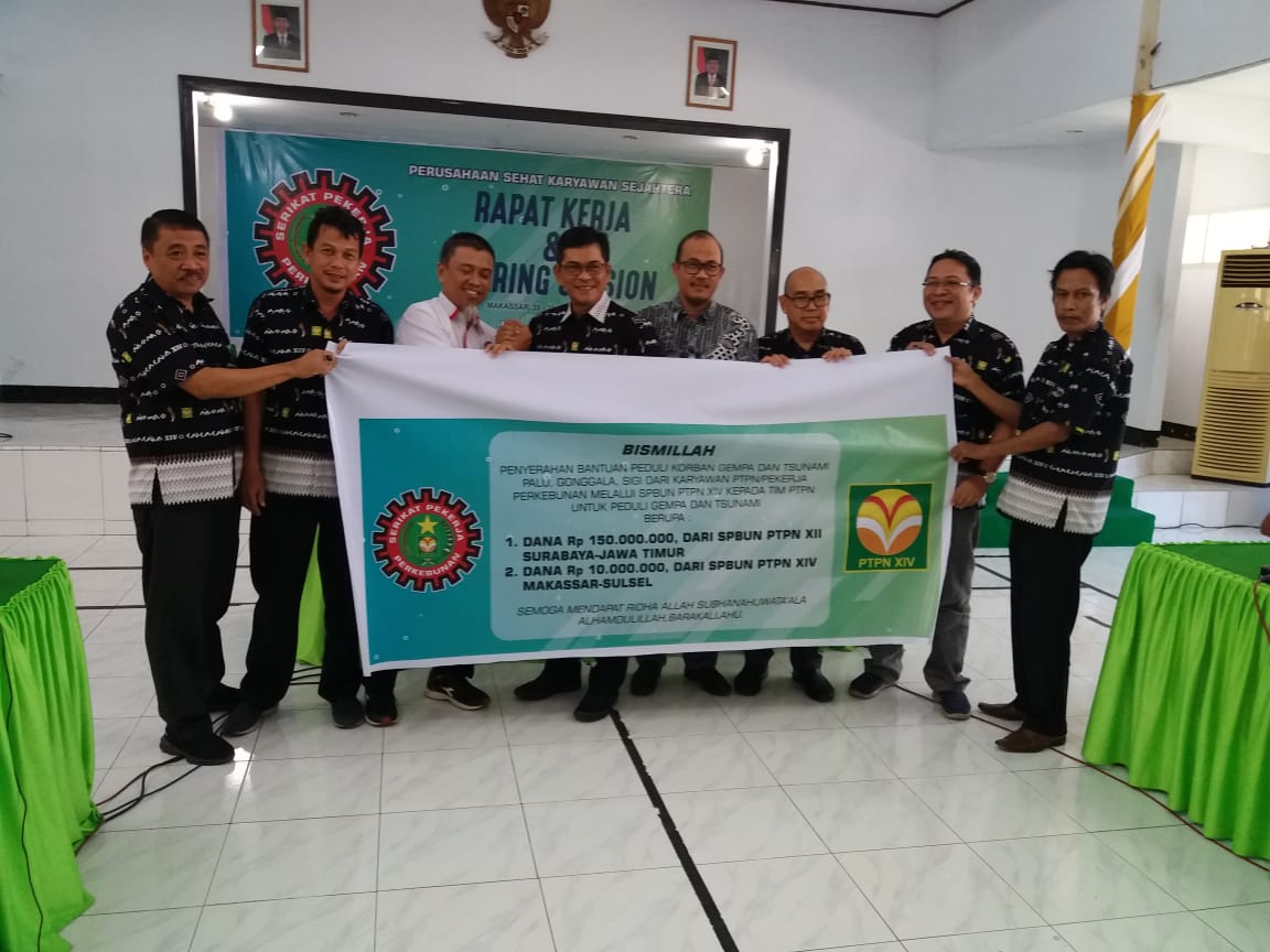 Acara penyerahan bantuan ini dilaksanakan di AULA BARUGA AGRO PTPN XIV Makassar, penyerahan bantuan dari ketua Tim peduli korban gempa PTPN XIV. Ir.H.Jemmy jaya.MBA kepada pengurus yayasan amal kebangsaan indonesia (YAKIN) dan dihadiri oleh Dirut PTPN XIV. Doni P Gandamiharja, Dir ops PTPN XIV Edy pieter, ketua serikat pekerja perkebunan PTPN dan pengurus se PTPN XIV.