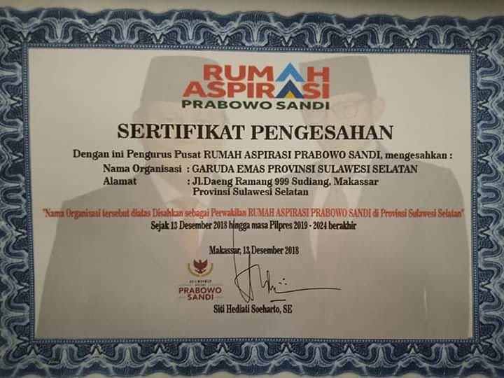Rumah Aspirasi Prabowo Sandi melalui Garuda Emas Sulsel akan segera dilakukan Rumah Aspirasi ini di 24 Kab / Kota.Rumah Aspirasi ini buka 24 jam untuk seluruh relawan.