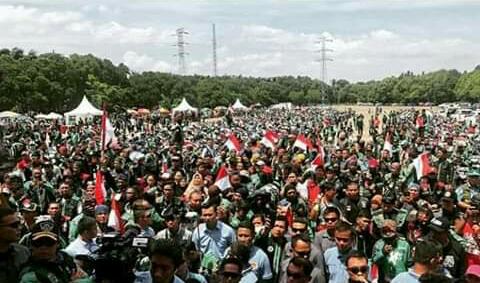 Yang menariknya, Prabowo memenuhi undangan tersebut dengan dibonceng oleh salah satu pengendara Ojol. Ribuan ojol yang berada di lokasi pun terlihat sumringah dengan mengibarkan bendera merah putih dan panji panji komunitas ojolnya saat Capres yang berpasangan dengan Sandiaga Salahuddin Uno itu hadir di tengah kerumunan massa. Prabowo pun langsung diminta naik keatas panggung.