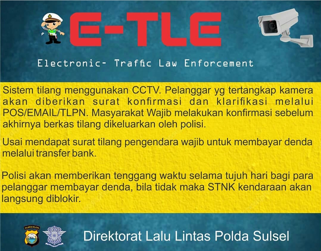 SULSELBERITA.COM. Makassar – Dalam rangka pelaksanaan Penindakan Pelanggaran lalu lintas dengan bukti Elektronik / CCTV (ETLE Elektronik Traffic Law Enforcement) atau istilahnya singkatnya TILANG KAMERA khususnya di Kota besar Makassar.