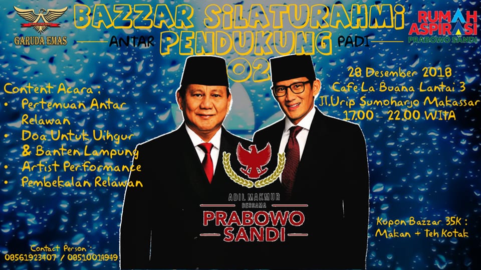 Bazzar Silaturahmi Antar Pendukung Prabowo Sandi ini digagas oleh Garuda Emas di Cafe La’Buana tanggal 28 Desember. Bazzar ini kami buka khusus untuk seluruh pendukung Bpk Prabowo & Bang Sandiaga Uno. Siapapun dapat hadir,baik dari kader partai serta sayap partai ataupun dari relawan-relawan yang siap berjuang full untuk kemenangan di pilpres 2019 nanti. Imbuh Jordan (Ketua Panitia Bazzar Silaturahmi)