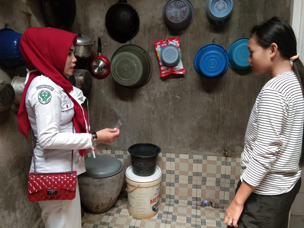 Kepala Puskesmas Ikhsan bersama  petugas Kesehatan Lingkungan (Kesling), petugas Promosi Kesehatan (Promkes), Bidan Pustu dan kader kesehatan tersebut, selain memberikan penyuluhan, Ikhsan juga memberikan Abate yang berguna untuk membunuh jentik-jentik nyamuk yang ada di penampungan air warga yang selama ini menjadi penyebab terjadinya DBD.