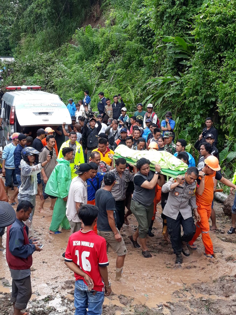 “Saat kami sedang bersih-bersih material longsor, ada mobil jenazah yang hendak melintas. Namun karena kondisi jalan yang tidak bisa diakses kendaraan, jadi kami membantu memanggul jenazah berpindah ke mobil yang disediakan di seberang jalan yang tidak terkena material longsor,” jelas Shinto saat dikonfirmasi melalui seluler.