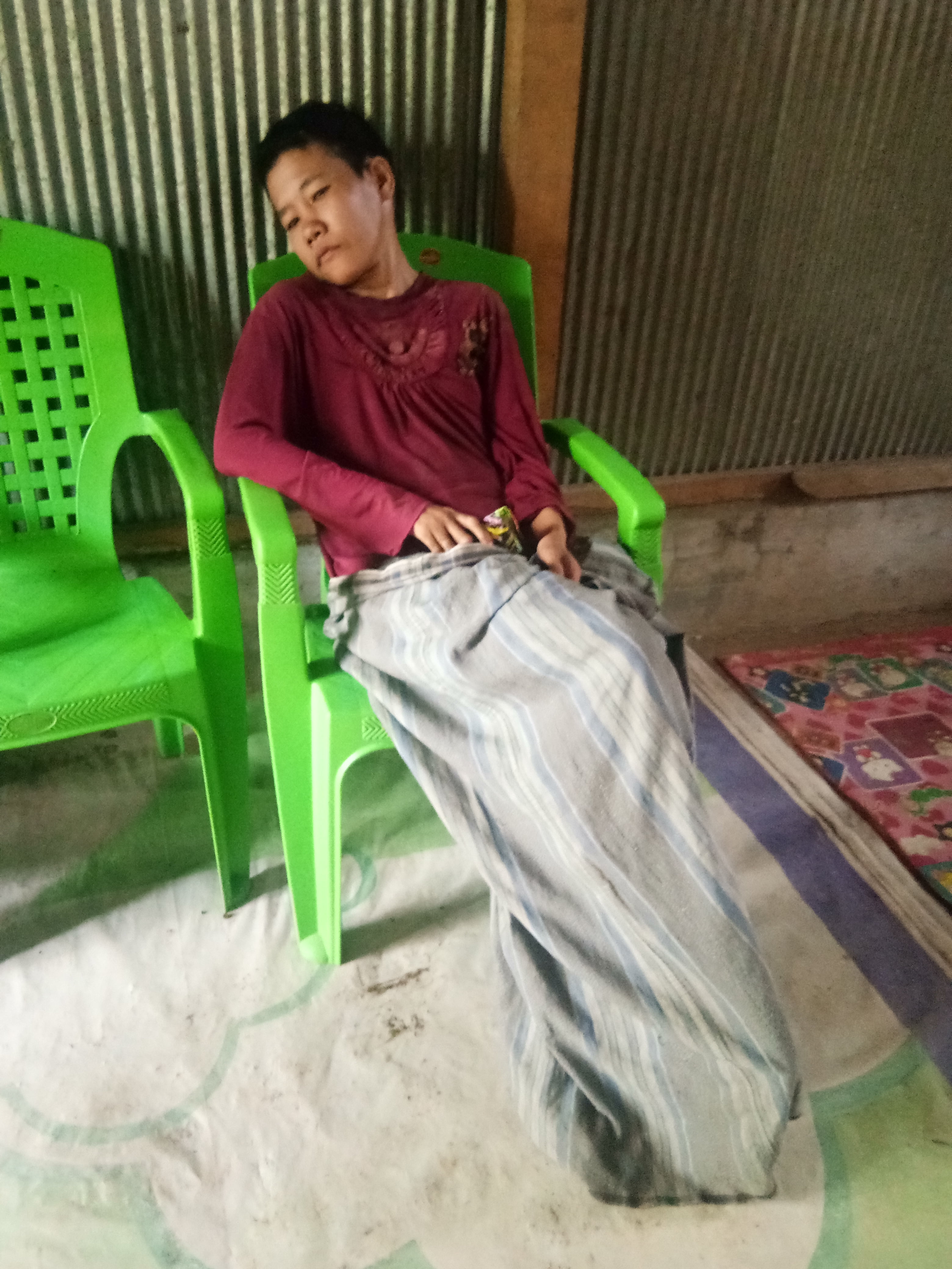 “Dia anak kedua saya, setiap hari hanya duduk saja kerjanya, tidak pernah bicara sudah bertahun tahun. Kami juga tidak pernah memeriksakan ke rumah sakit ataupun dokter, karena kami orang miskin dan tidak punya biaya”. Jelasnya sedih.