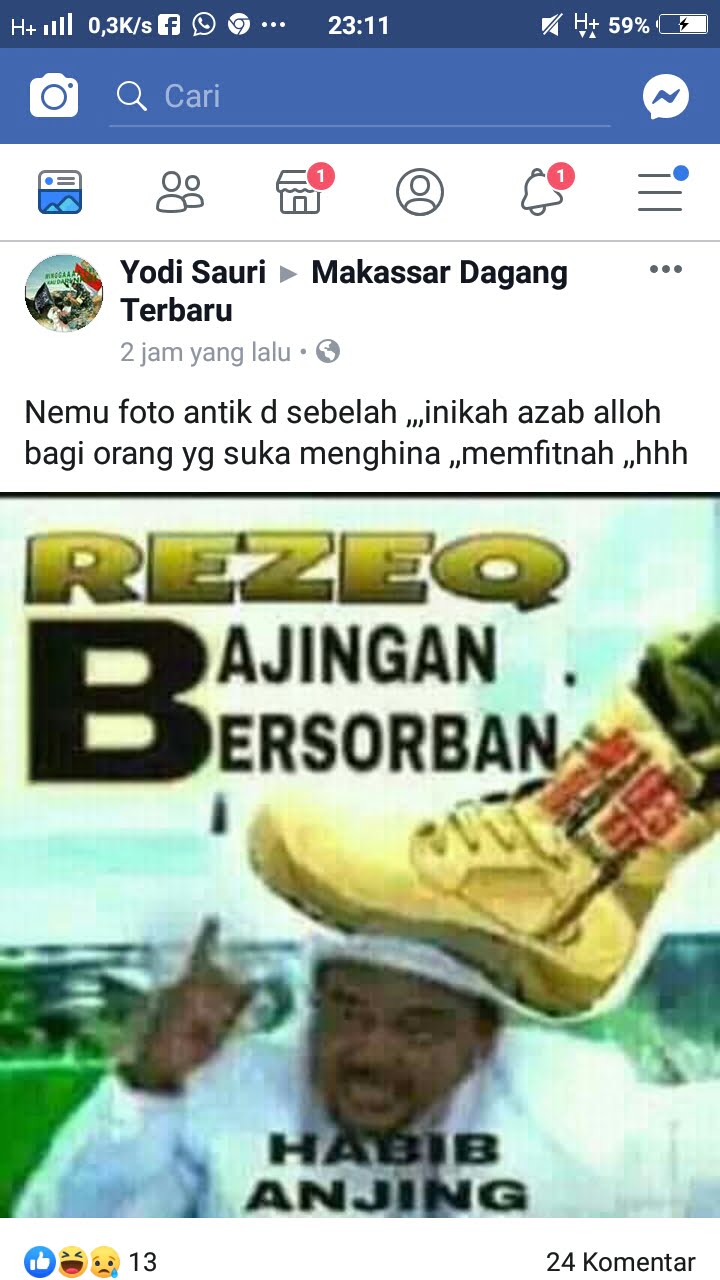 “Nemu foto antik d sebelah ,,,inikah azab alloh bagi orang yg suka menghina ,,memfitnah ,,hhh”. Tulis Yodi Asuri yang disertai dengan gambar Habib Riziq yang kepala nya di injak dan ada tulisan ” Rezeq Bajingan bersorban, Habib ANJING”.