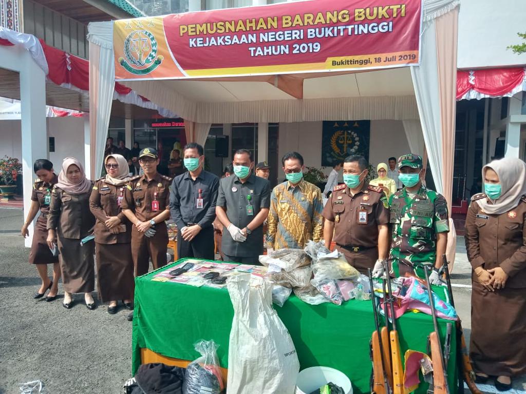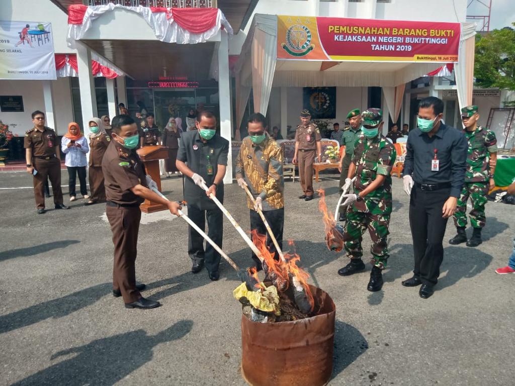 SULSELBERITA.COM. Bukittinggi – Menjelang peringatan hari Adhyaksa yang jatuh setiap tanggal 22 Juli setiap tahunnya, pihak kejari Bukittinggi mewarnai dengan pemusnahan barang bukti (BB) berupa ribuan gram berbagai jenis Narkoba, yang disaksikan langsung oleh Wakil Walikota Bukittinggi, Irwandi, Dandim 0304 Agam, Letkol Inf. Victor Andhyka Tjokro, perwakilan dari Polres Bukittinggi, Pengadilan Negeri Bukittinggi serta perwakilan Forkopimda Kota Bukittinggi.  Kamis, (18/7/2019).