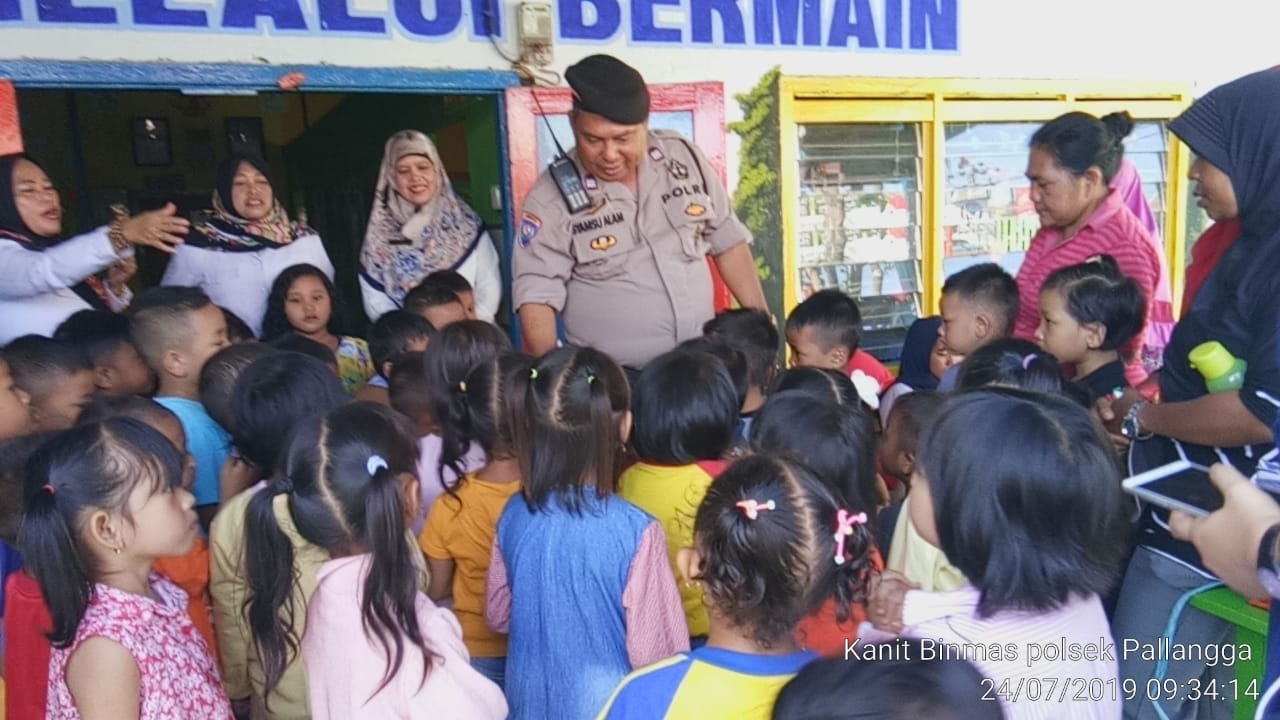 SULSELBERITA.COM. Gowa-Kanit Binmas Polsek Pallangga Gowa Aiptu Syamsu Alam bersama Bhabin Aipda Hamzah menyambangi Sekolah Taman Kanak Kanak /TK Idata Kel Mangali Kec Pallangga Kab Gowa, Rabu 24/07/2019) pagi tadi.