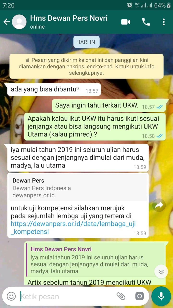 “Mulai tahun 2019, untuk memperoleh kompetensi, wartawan harus mengikuti UKW sesuai dengan jenjang yang ada, yakni Muda, Madya dan Utama, Pemimpin redaksi (Pemred) sekalipun,” tegasnya saat dihubungi melalui sambungan whatsapp, Rabu (30/10).