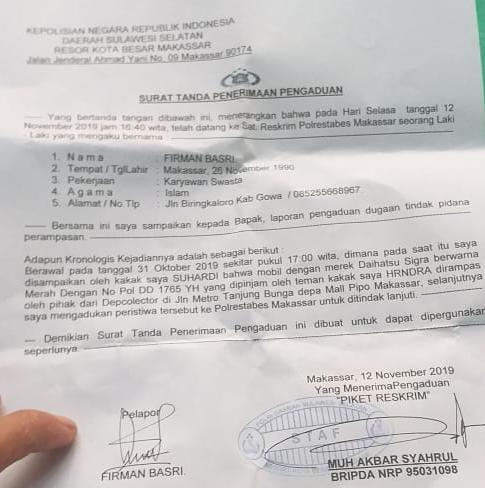 Dilain Tempat Firman pun mengaku setelah mengetahui Kabar Bahwa Mobilnya Di Rampas Sehingga mengadukan kejadian itu ke Polrestabes Makassar.