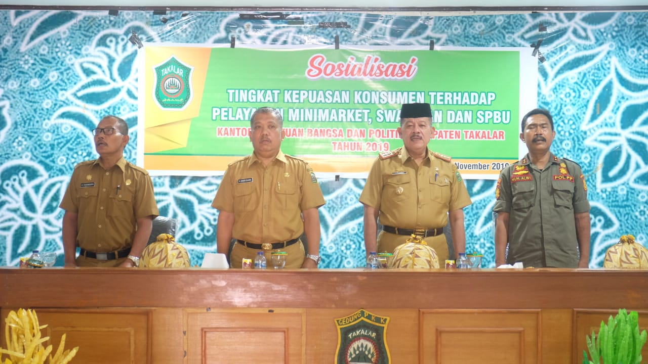 Sementara itu Kepala Kesbangpol Kab. Takalar H. Syafaruddin, S.Ip dalam laporannya menyampaikan maksud dan tujuan dari sosialisasi ini untuk mengetahui variabel harga, produk dan pelayanan secara bersama-sama pelanggan Minimarket, swalayan dan SPBU, untuk mengetahui pengaruh variabel harga, produk dan pelayanan secara parsial terhadap kepuasan konsumen minimarket Swalayan dan SPBU serta untuk mengetahui variabel yang lebih dominan terhadap kepuasan konsumen.