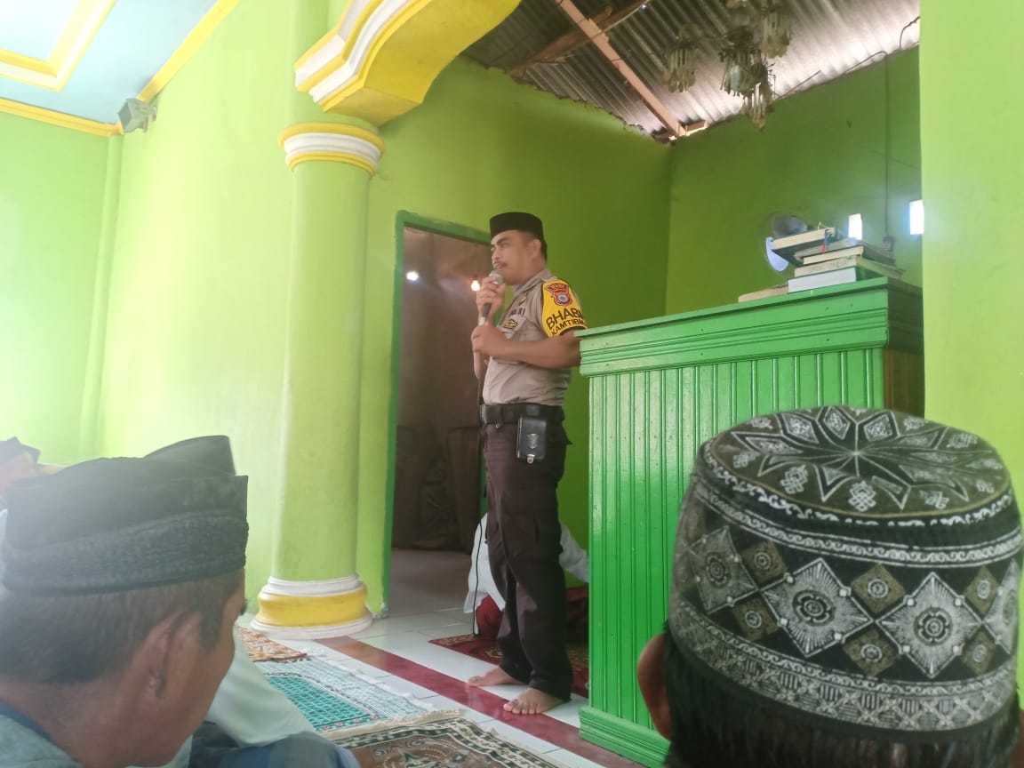 Usai Melaksanakan Shalat Jum’at berjamaah bersama warga binaannya Bhabinkamtibmas.Aipda Erwin menyempatkan diri menyampaikan menyampaikan himbuan Kamtibmas, dalam himbauannya Aipda Erwin menyerukan kepada para jammah jumaat agar memperkuat persatuan dan kesatuan dan saling hirmat menghormati antar umat beragama. Selain itu Bhabinkamtibmas juga menyampaikan agar masyarakat bijak dalam bermedia sosial, karena banyak beredar berita berita “hoax” yang tidak di ketahui kebenarannya dan sumbernya, kami harap kepada masyarakat untuk cerdas dan pandai serta jangan mudah terprovokasi dengan berita atau isu yang tidak benar serta agar selalu menjaga keamanan dan ketertiban.