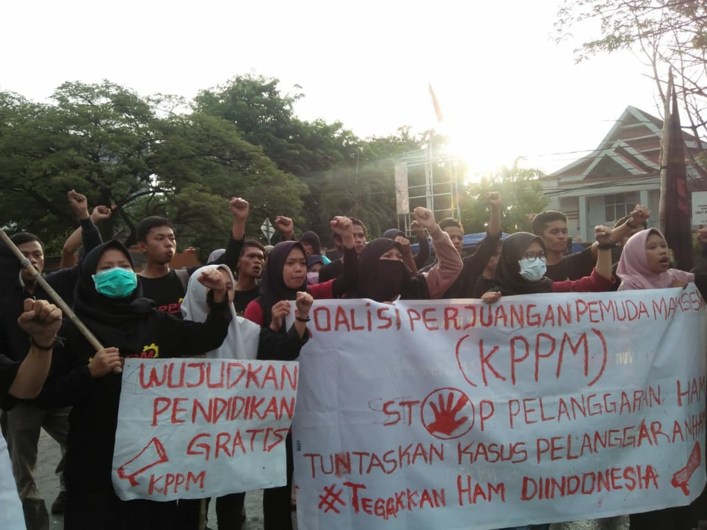 SULSELBERITA.COM. Gowa-Koalisi perjuangan pemuda mahasiswa (KPPM) di tanggal 10 desember 2019 kembali menggelar aksi memperingati hari Hak Asasi Manusia (HAM) tepatnya pukul 16:00 wita massa aksi bergeser ke lokasi aksi di jalan Sultan Alauddin depan Kampus Unismuh Makassar. Dimana organisasi pemuda dan mahasiswa yang membawa massa aksi sekitar 50 orang tersebut kemudiaan membawa 6 Tuntutan KPPM.