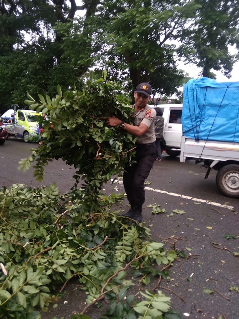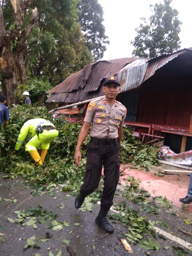 Dengan menggunakan alat seadanya kapolsek bersama masyarakat membersihkan ranting pohon yang menimpa rumah warga dan menutupi sebagian jalan.