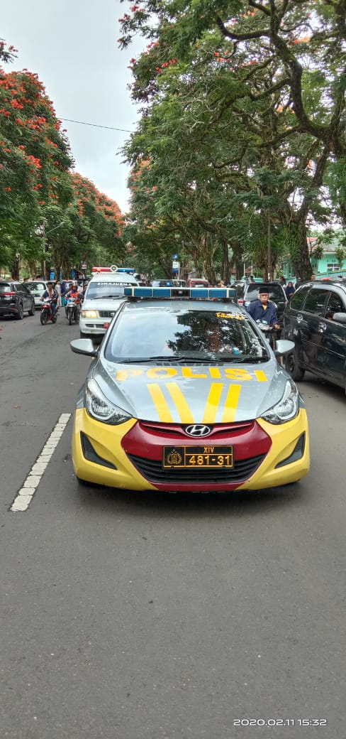 Dengan menggunakan mobil dinas patroli milik Polsek Tinggimoncong saat melaksanakan pengawalan jenasah.