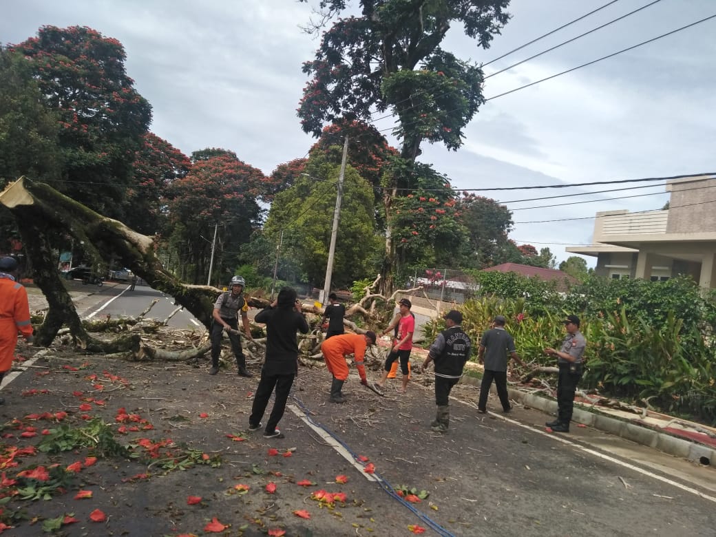 Semangat dan kerja sama yang baik di perlihatkan Bhabinkamtibmas bersama warga saat membersihkan pohon tumbang yang menutupi badan jalan endang.
