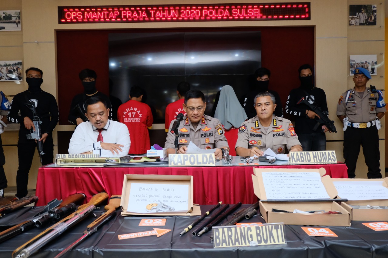 SULSELBERITA.COM. Makassar,- Kapolda Sulsel Irjen Pol Drs. Mas Guntur Laupe didampingi Kabid Humas Polda Sulsel Kombes Pol Ibrahim Tompo memimpin langsing Pess Release pengungkapan kasus Pembuatan dan Penguasaan senjata api dan amunisi ilegal yang berhasil diungkap oleh tim gabungan Resmob Polda sulsel, Sat Reskrim Polres Maros dan Sat Reskrim Polres Wajo, Senin (17/02/2020)