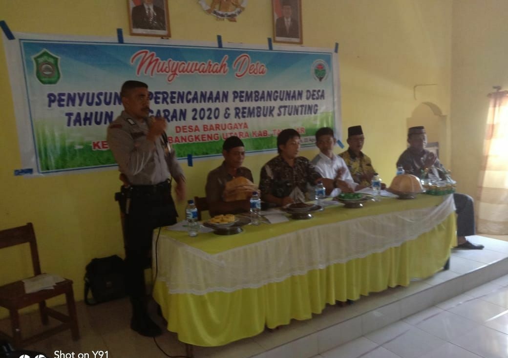 SULSELBERITA.COM. Takalar – Bhabinkamtibmas Polongbangkeng Utara Polres Takalar hadiri Musyawarah Desa dalam rangka pembahasan dan penetapan rencana kerja pembangunan Desa ( RKPDes ) Tahun 2020 di desa binaannya yang bertempat di Aula Balai Desa Barugaya. Rabu (19/02/2020).