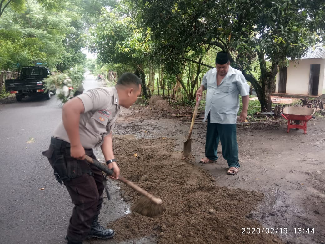 Bersama Warga, tampak petugas Bhabinkamtibmas secara bersama sama menimbun jalan poros kecamatan yang berlubang akibat guyuran air hujan dan dampak dari mobil angkutan berat yang sering lalu lalang dilokasi tersebut sehingga tidak terjadi kemacetan dan kecelakaan lalulintas