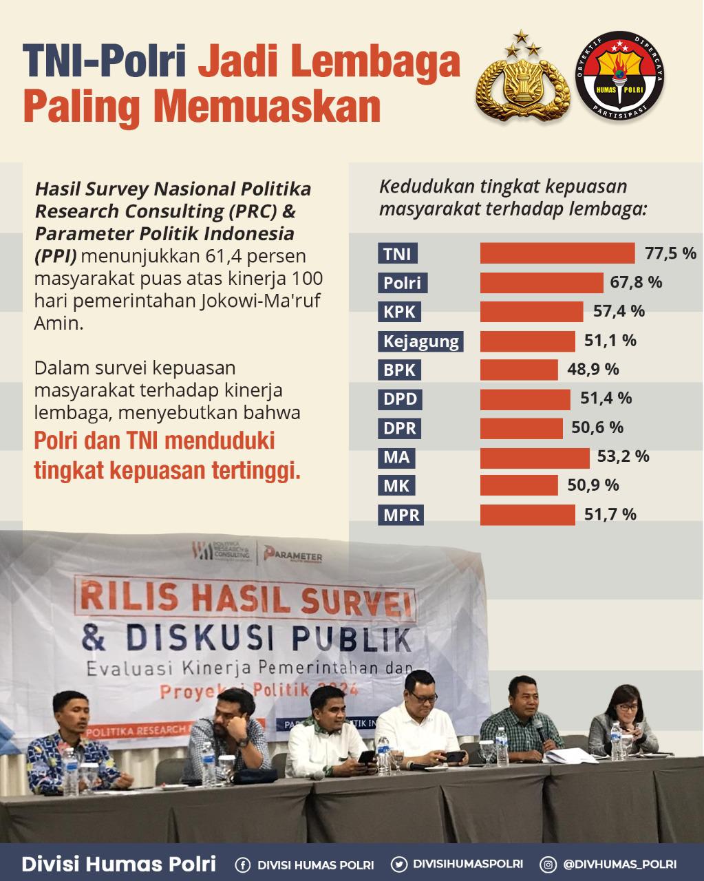 Dalam survey tersebut, TNI memperoleh 77,5 persen disusul oleh Polri sebesar 67,8 persen. Survey tersebut juga menunjukkan 61,4 % masyarakat puas atas kinerja 100 hari pemerintahan Jokowi-Ma’ruf Amin.