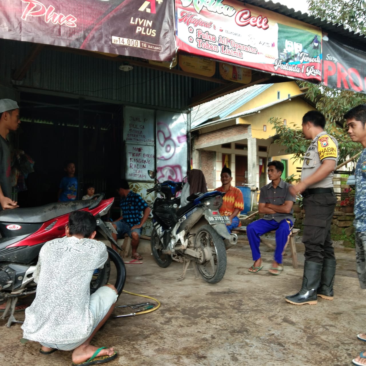 Saat melaksanakan patroli di wilayah binaannya Bhabinkamtibmas melihat warganya sedang asik ngumpul di bengkel,dengan sigap Bhabinkamtibmas temui warganya.