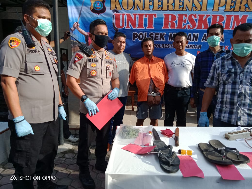 Pelaku yang saat itu mengetahui kedatangan Polisi langsung bersembunyi di bawah termpat tidur di dalam sebuah rumah yang berada di Jalan Bantan Kelurahan Banten Kecamatan Medan Tembung. Pelaku serta barang bukti yang diamankan antara lain 1 satu buah samurai , kabel listrik yang digunakan untuk mengikat korban.” Jelas Mantan Kapolres Oku Palembang ini