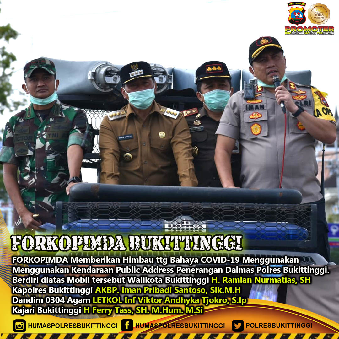 Dengan menggunakan kendaraan publik adress penerangan Dalmas Polres Bukittinggi, yang dipimpin langsung oleh lWalikota Bukittinggi H.Ramlan Nurmatias. SH, didampingi Kajari Bukittinggi H.Feey Tass.SH.M.Hum. M.Si, Kapolres Bukittinggi Imam Pribadi Santoso. Sik.M.H, Dandim 0304 Agam Letkol Inf.Viktor Andyka Tjokro.S.Ip. Selasa, (24/3/2020).