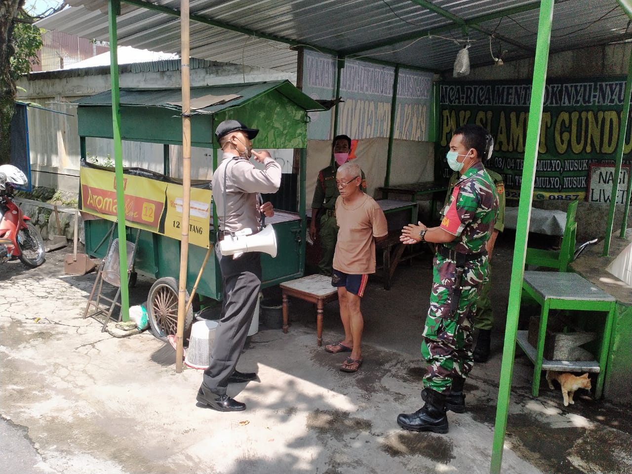 Babinsa Nusukan Koramil 02/Banjarsari Kodim 0735/Surakarta Serka M. Nasirin Bersinergis dengan Bhabinkamtibmas dan Linmas melaksankan kegiatan patroli dan sosialisasi kepada pedagang  kaki lima ( warung ) Di areal RW 05.
