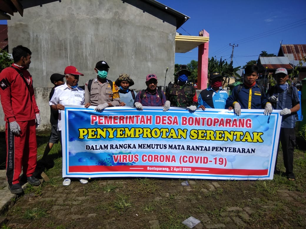 SULSELBERITA.COM. Takalar – Bhabinkamtibmas Desa Bontoparang Polsek Marbo Polres Takalar Bripka Soelfian bersama Plt. Kades Bontoparang Abdul Arsad.SE beserta aparatnya dan Babinsa Desa Bontoparang Serda Syarifuddin melakukan penyemprotan desinfektan di Mesjid-mesjid dan Kantor Pemerintahan serta di perumahan warga yang ada di Desa Bontoparang semata mata hanya untuk pencegahan dan penularan Covid 19 atau yang biasa di sebut Virus Corona, Kamis (02/04) siang.