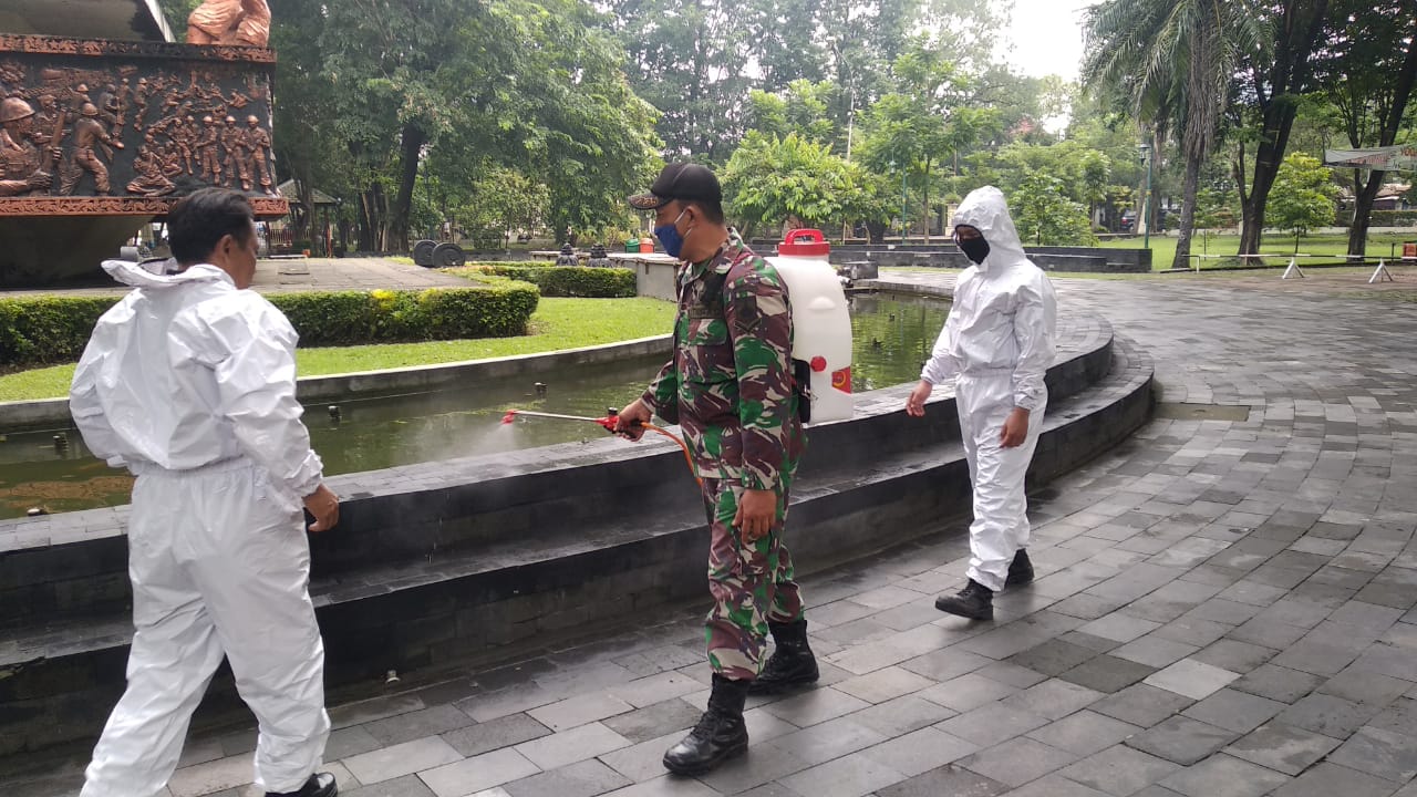 Babinsa Kelurahan Stabelan Koramil 02/Banjarsari Kodim 0735/Surakarta Serda Rahmad Syukur, Linmas dan instansi lainnya melaksankan penyemprotan Disinfektan di areal Monumen Banjarsari 45 (Monjari), Kegiatan penyemprotan tersebut untuk mencegah penyebaran virus corona yang saat ini menyebar di wilayah Kota Surakarta.