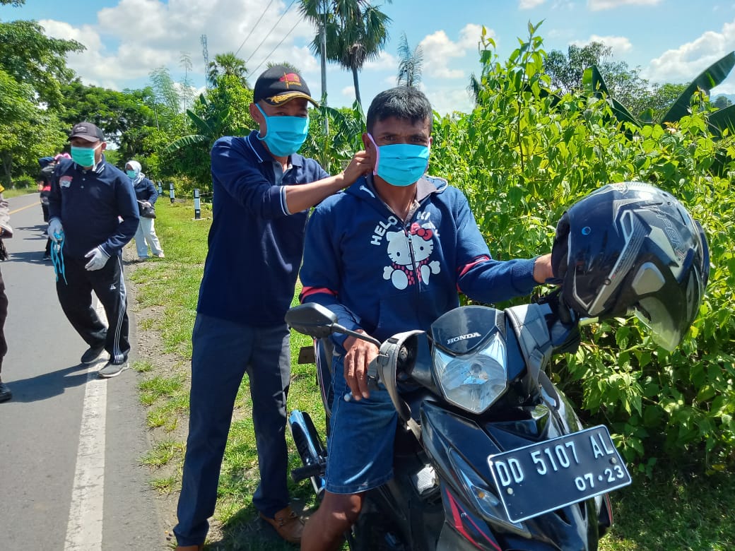 SULSELBERITA.COM. Jeneponto – Keluarga Besar Persatuan Perangkat Desa Indonesia Kabupaten Jeneponto, Sulawesi selatan menggelar aksi bagi-bagi masker sebagai bentuk kepedulian dan upaya menyemangati warga untuk tetap tabah dan waspada hadapi situasi pandemi wabah corona, di Kabupaten Jeneponto, Minggu (5/4/2020).