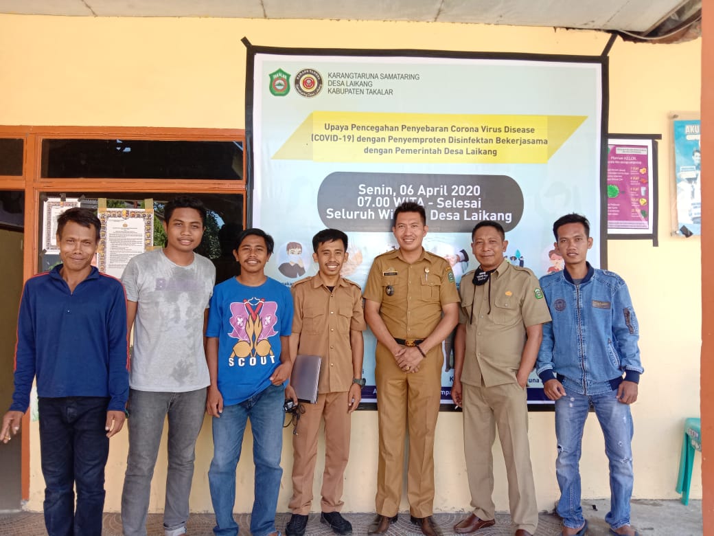 Saya selaku Pj Kades Laikang sangat mengapresiasi giat yang telah di laksanakan oleh adik-adik dari Karang taruna Samataring yg mana telah membantu kami di desa dalam pencegahan & pemutusan mata rantai penularan virus covid-19 dengan penyemprotan cairan desinfektan di semua dusun yang di wilayah desa Laikang khususnya di tempat-tempat ibadah semoga, adik-adik dari KTS selalu ikut serta dlm berbagai giat di desa dan selalu berkreasi dalam kegiatan positif didesa sehingga bisa mengharumkan nama desa khususnya,ungkap beliau sambil tersenyum.