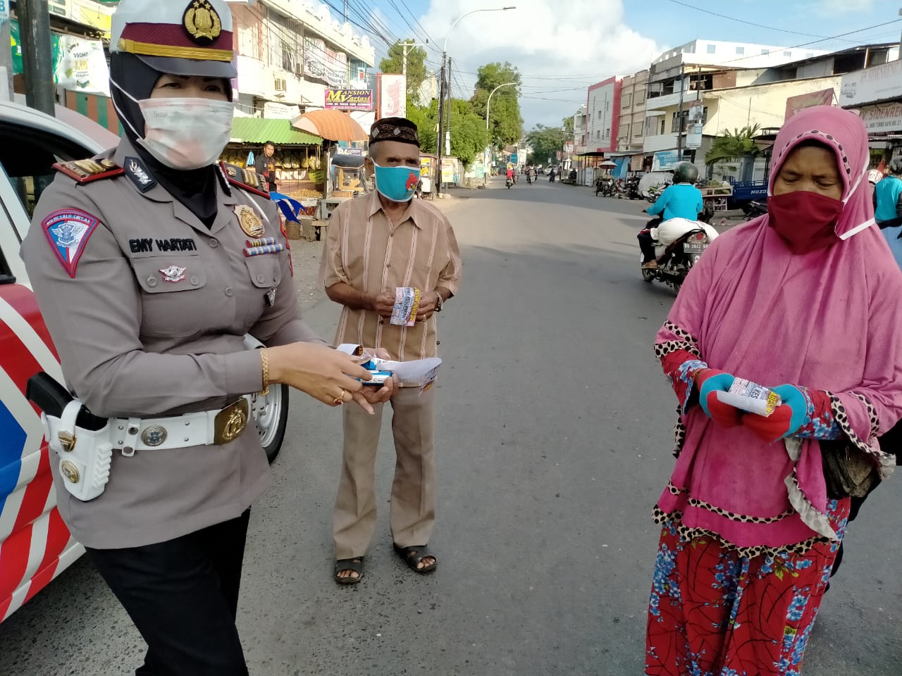 “Selain masker kita juga bagikan sabun cuci tangan dan sekaligus menerapkan memberikan mengedukasi masyarakat tata cara membersihkan tangan yang baik dan benar.