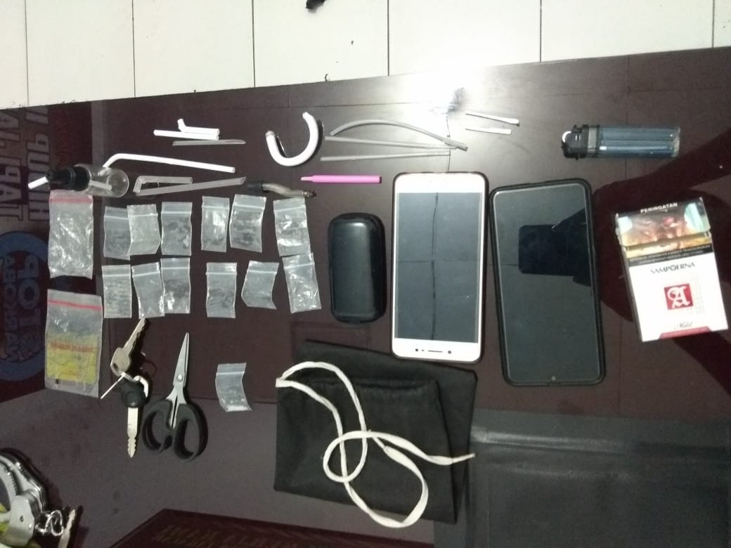 Setelah kedua tersangka diamankan, kemudian dilakukan penggeledahan dan ditemukan barang bukti berupa satu saset plastik bening diduga Sabu di dekat terduga yang sempat dibuang oleh RM(28) kemudian diperlihatkan kepada terduga pelaku dan mengakui bahwa Sabu tersebut adalah miliknya.